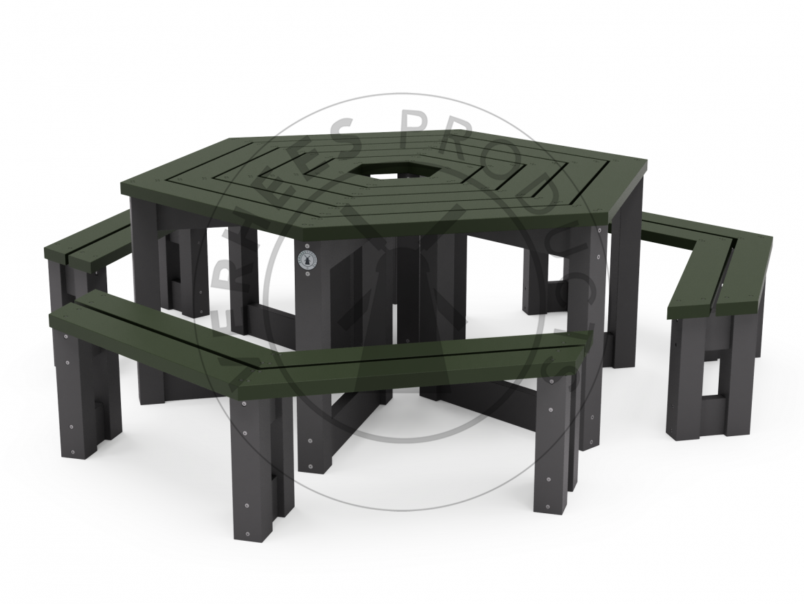 Vraag uw offerte aanDe Field Green ® picknickset Sion is een duurzame, circulaire en onderhoudsarme oplossing voor buiten. De tafel is gemaakt van 50% gerecycled kunstgras en 50% gerecycled kunststof, waardoor het materiaal een tweede leven krijgt nadat het op sportvelden is gebruikt. De picknickset is rot- en splintervrij, bestand tegen intensief gebruik en kan het hele jaar door buiten blijven staan. De Sion biedt comfortabel plaats aan 8 tot 10 personen en is ideaal voor scholen, gemeenten, sportparken en andere openbare ruimtes. De tafel heeft een zeshoekige vorm en wordt geleverd met 3 losse bankjes. Dankzij de stevige constructie staat de tafel stabiel op elke ondergrond. De Sion is verkrijgbaar in het groen.