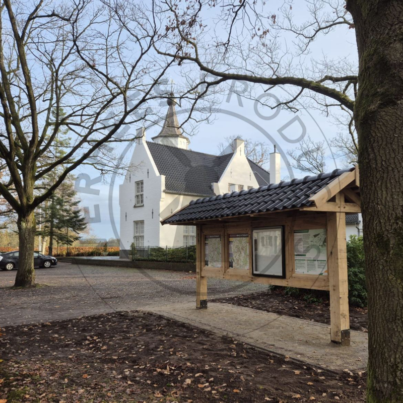 Het informatiebord bestaat uit vier kaders en is dubbelzijdig opgesteld. Eén van de kaders is uitgevoerd als vitrinekast, geschikt voor het presenteren van documenten of mededelingen achter glas.