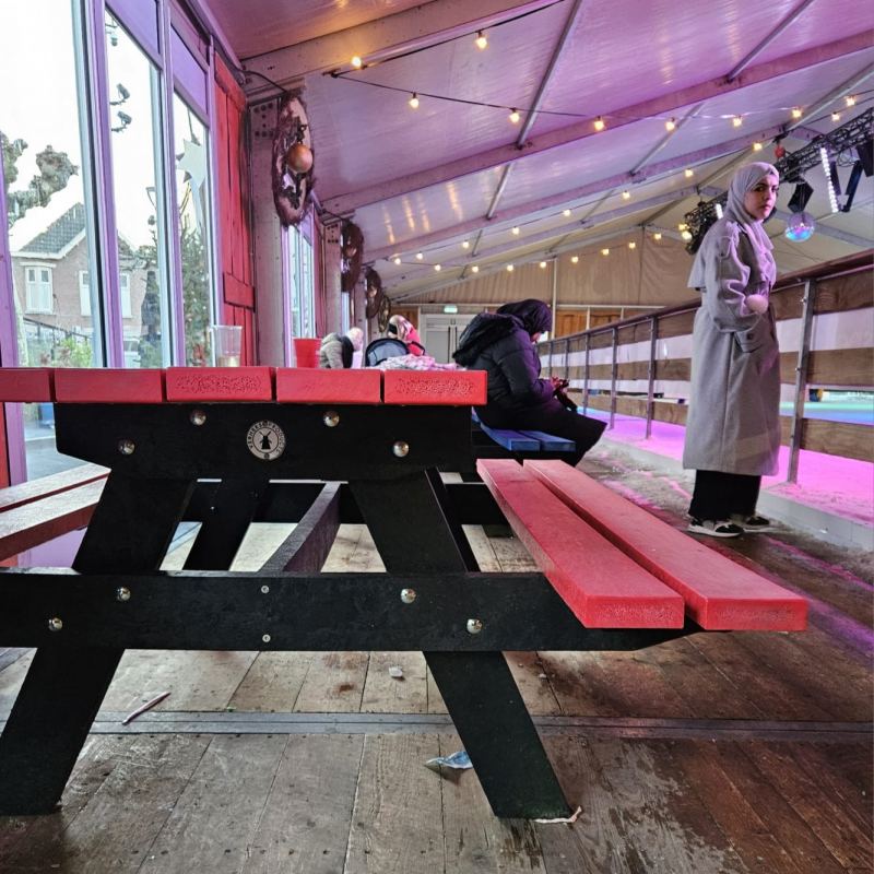 Voor een winterevent in Boxtel zijn kleurrijke picknicksets van gerecycled kunststof geplaatst. Tijdens het evenement bieden ze een prettige plek om even te zitten en op te warmen na een rondje op het ijs. Een moment van rust, midden in de gezelligheid.