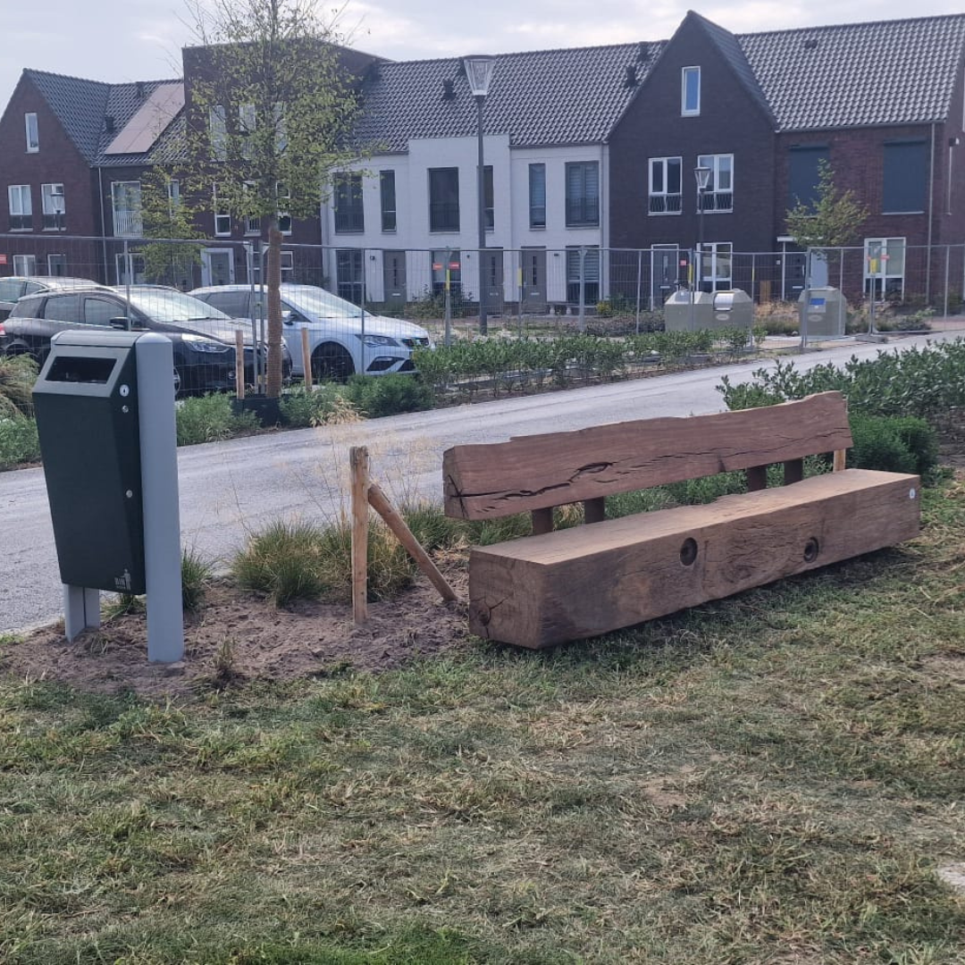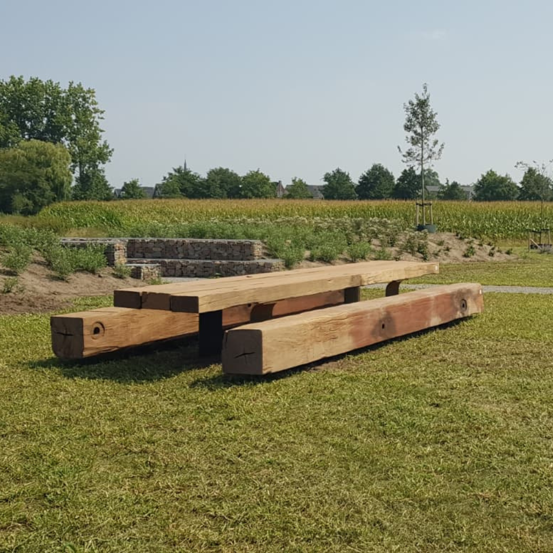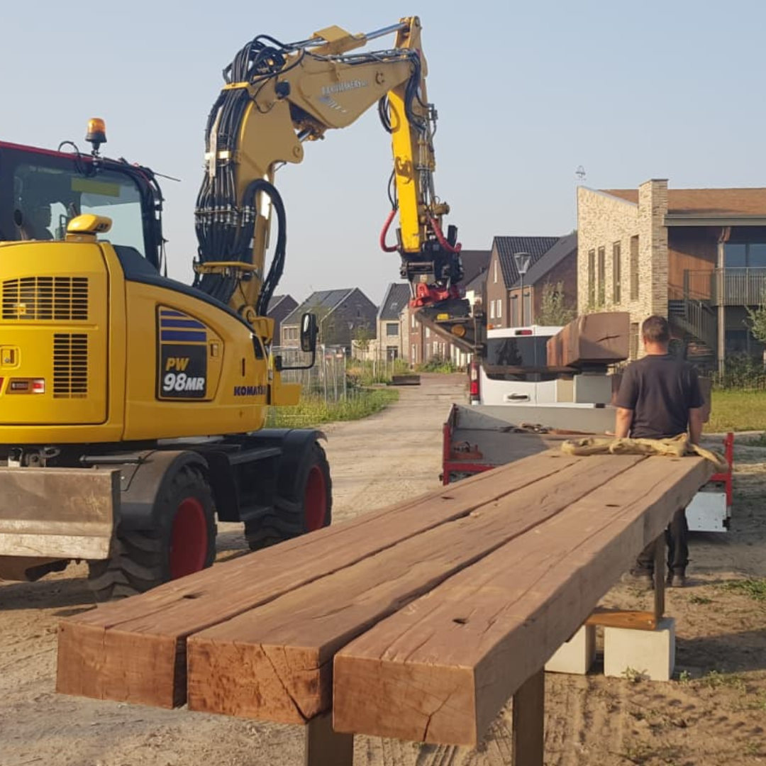 De aanleiding kwam uit het ontwerp: de landschapsarchitect zocht meubilair met een robuuste uitstraling. Rogier Biekens, eigenaar van VERHEES PRODUCTS, liet daarop referentiebeelden zien van een eerder project bij de gevangenis in Haaren (België), waar oude meerpalen al eens een tweede leven kregen als robuuste set van banken en tafel. Dat bleek de juiste snaar te raken: precies het ruige, doorleefde beeld waar het ontwerpteam naar zocht. Het duurzame FSC-gecertificeerde hout van de meerpalen is door jaren in zeewater als het ware “verduurzaamd”: zoutkristallen en langdurige belasting maken het materiaal hard, vormvast en weerbestendig. Voor de productie volstonden het verwijderen van schelpen, opschuren en voorbereidende bewerkingen voor de montage. Materiaalverlies bleef daarmee minimaal.