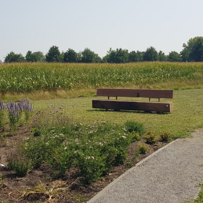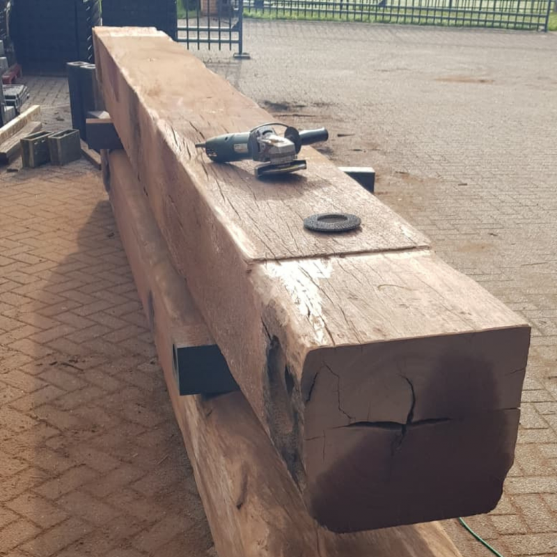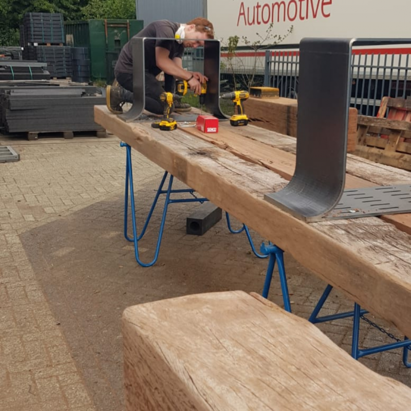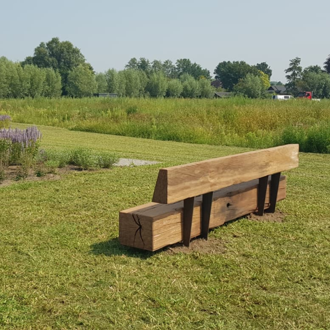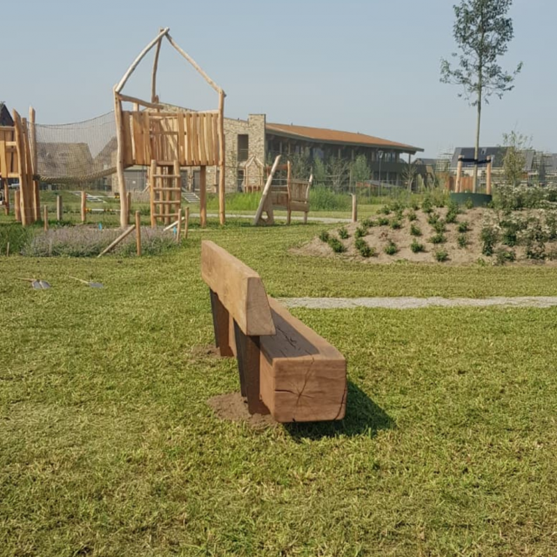 De aanleiding kwam uit het ontwerp: de landschapsarchitect zocht meubilair met een robuuste uitstraling. Rogier Biekens, eigenaar van VERHEES PRODUCTS, liet daarop referentiebeelden zien van een eerder project bij de gevangenis in Haaren (België), waar oude meerpalen al eens een tweede leven kregen als robuuste set van banken en tafel. Dat bleek de juiste snaar te raken: precies het ruige, doorleefde beeld waar het ontwerpteam naar zocht. Het duurzame FSC-gecertificeerde hout van de meerpalen is door jaren in zeewater als het ware “verduurzaamd”: zoutkristallen en langdurige belasting maken het materiaal hard, vormvast en weerbestendig. Voor de productie volstonden het verwijderen van schelpen, opschuren en voorbereidende bewerkingen voor de montage. Materiaalverlies bleef daarmee minimaal.